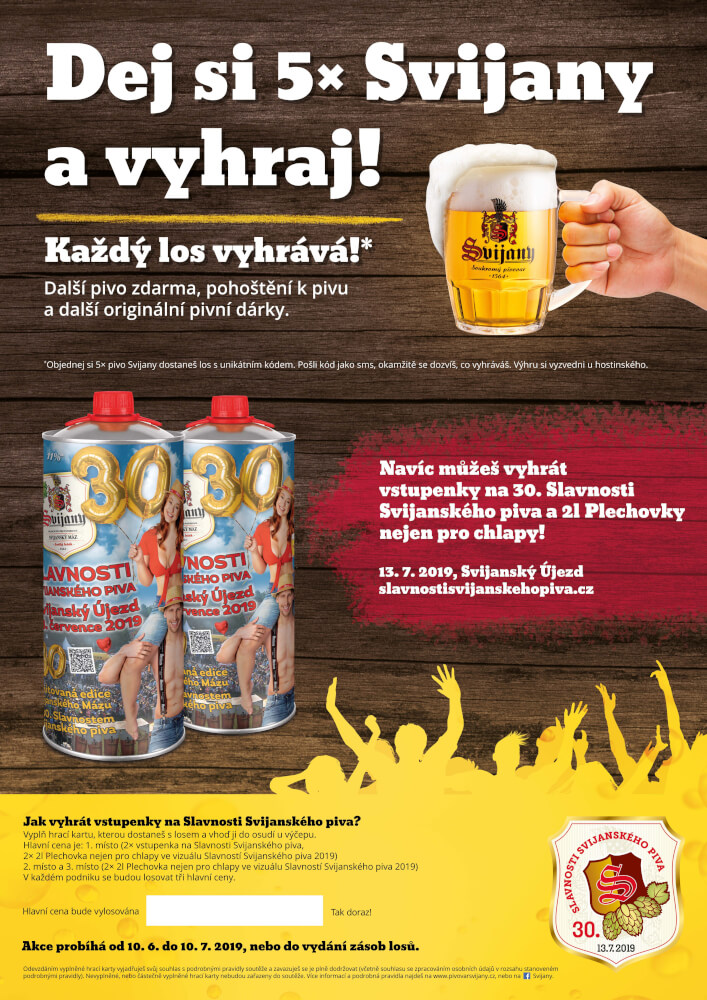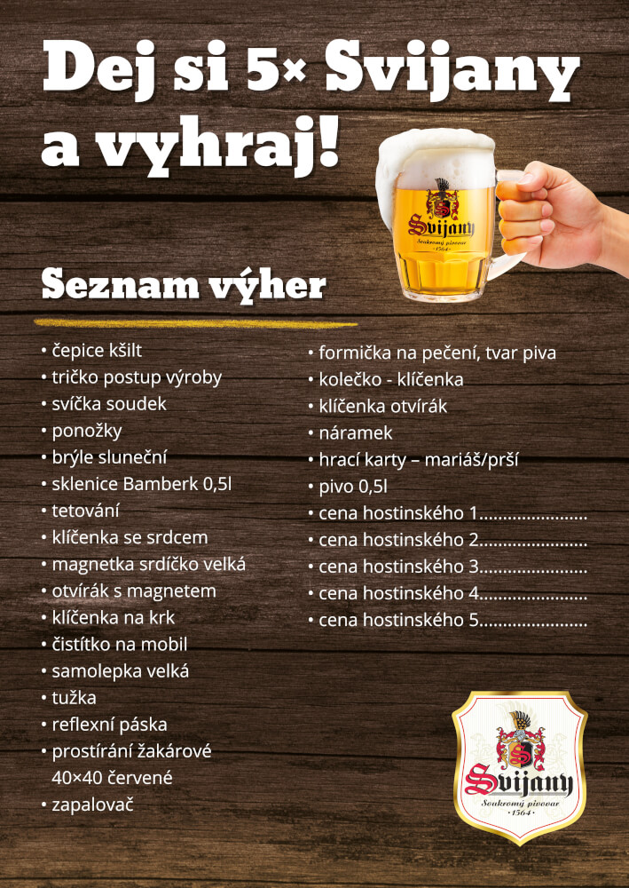 Objednej si 5x pivo Svijany a od obsluhy dostaneš výherní los s unikátním kódem. Zašli kód pomocí SMS, obratem dostaneš SMS, ve které se dozvíš, čo vyhrávaš. Výhru si vyzvedni u hostinského.