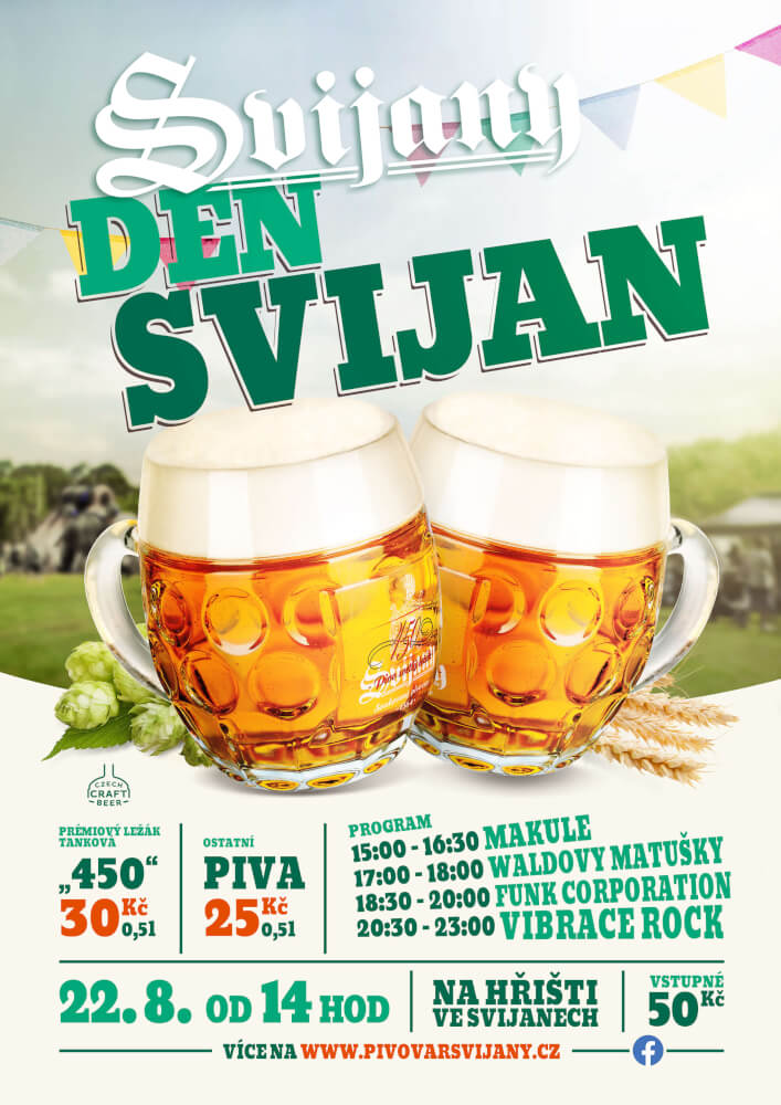 Přijďte za námi na den Svijan ve Svijanech na hřišti. Již v sobotu 22. srpna od 14:00. Vstup za 50 Kč, pivo už od 25 Kč a zahrají Waldovy Matušky a další