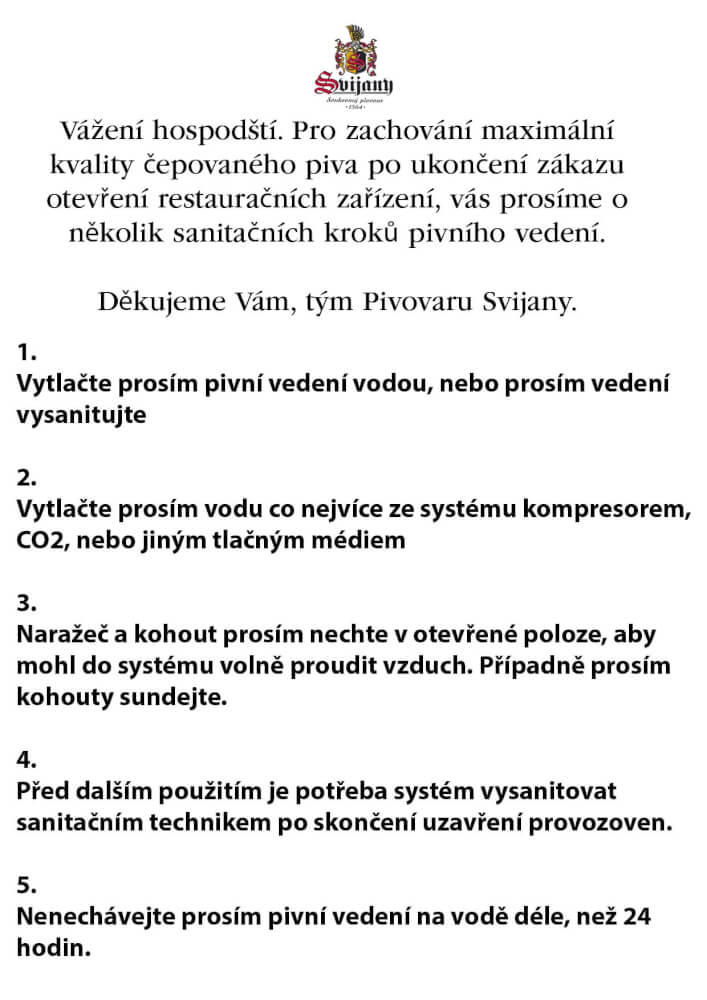 Vážení hospodští. Pro zachování maximální kvality čepovaného piva po ukončení zákazu otevření restauračních zařízení, vás prosíme o několik sanitačních kroků pivního vedení.