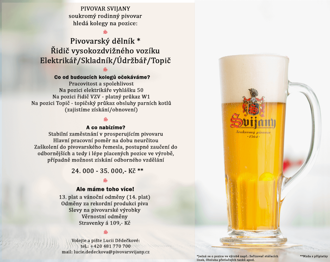 PIVOVAR SVIJANY, a.s. dodržuje platný zákon o regulaci reklamy, Kodex rady pro reklamu a dobrovolný etický kodex Iniciatviy zodpovědných pivovarů. Proto žádáme osoby mladší 18 let, aby nevstupovaly na naše internetové stránky. Děkujeme za pochopení.