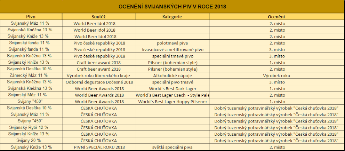 Pivovar Svijany si zakládá na tradičním výrobním postupu tzv. dvourmutového způsobu vaření, kvašení v otevřených kádích a dlouhodobého zrání piva v ležáckých sklepích. Všechna jeho klasická, nepasterovaná česká piva doprovází dlouhý seznam různých cen. Letos stála na stupních vítězů například na začátku roku, kdy si odnesla stříbrné medaile z třetího ročníku profesionální degustační soutěže piva World Beer Idol, dále v soutěžích Pivo české republiky nebo Craft beer awards (viz tabulka).