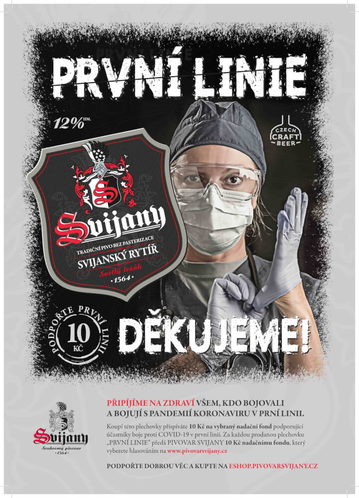 Epidemie nemoci COVID-19 je, zdá se, na ústupu. Na oslavu toho, že se tento týden konečně po více než dvou měsících vynucené pauzy opět otevírají restaurace a hospody, a jako poděkování všem, kdo se s koronavirem bezprostředně utkávali, uvádí pivovar Svijany na trh limitovanou sérii ekologických dvoulitrových plechovek piva PRVNÍ LINIE. „Chceme tím vzdát hold všem, kteří bojovali a bojují s pandemií koronaviru v první linii, a současně jim chceme vyjádřit naši vděčnost i formou finanční podpory. Za každou prodanou plechovku věnujeme částku 10 Kč na vybraný nadační fond podporující účastníky boje proti COVID-19 v první linii,“ oznámil ředitel Pivovaru Svijany Roman Havlík.
