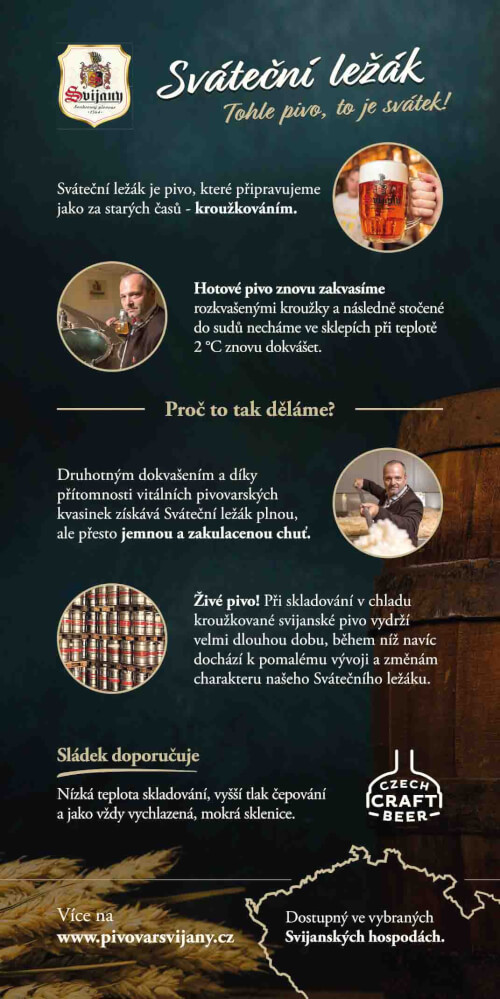 „Sváteční ležák je kroužkované pivo inspirované starými recepturami, podle nichž se v minulém století vařilo pivo zavážené před zimou na nepřístupné horské chaty. Hotové pivo se tak po filtraci znovu zakvašuje rozkvašenou mladinou, tzv. kroužky, a po opětovném zakvašení plní do sudů, v nichž dokváší potřetí. Sváteční ležák proto obsahuje velké množství živých pivovarských kvasinek plných vitamínů skupiny B,“ přibližuje novinku svijanský sládek Petr Menšík.