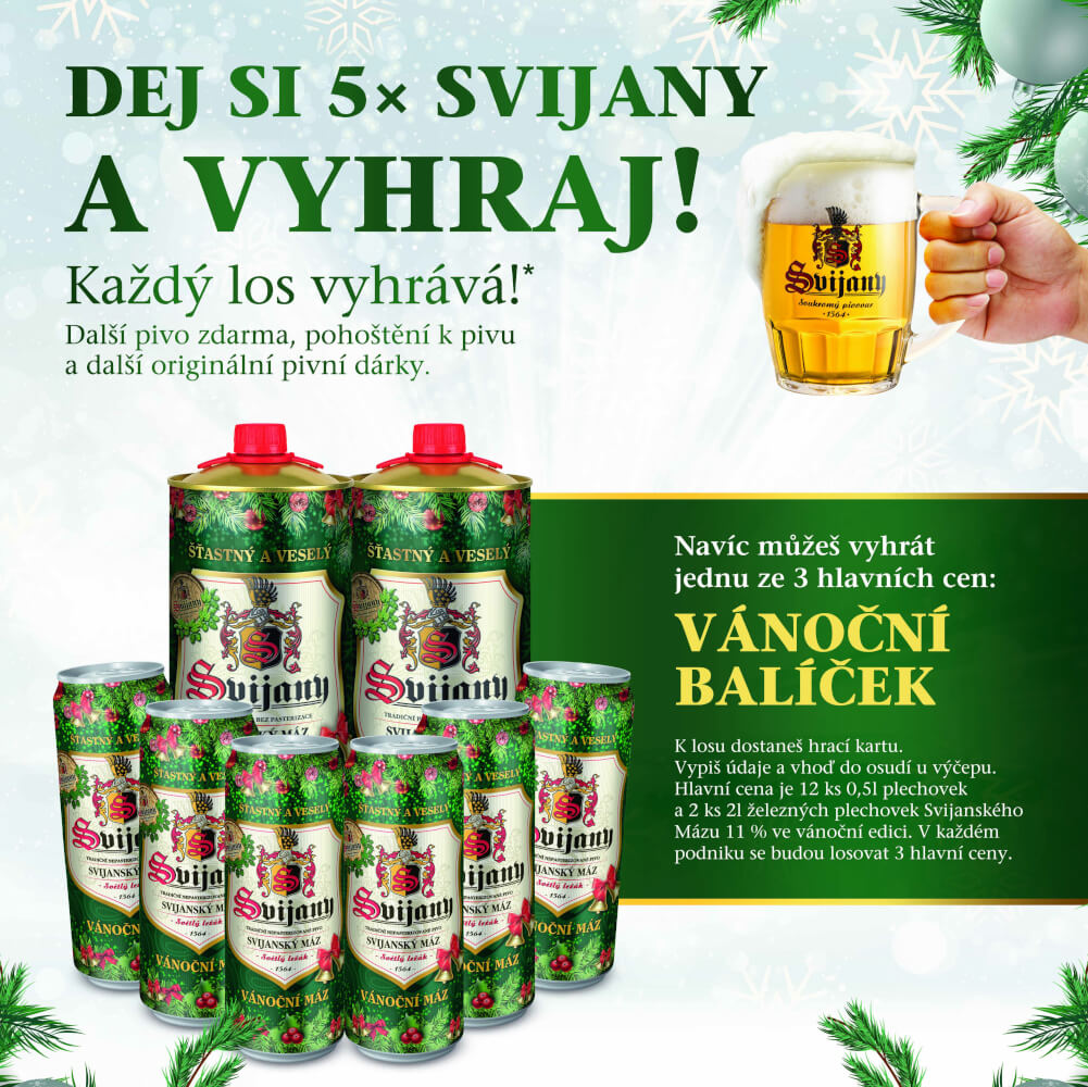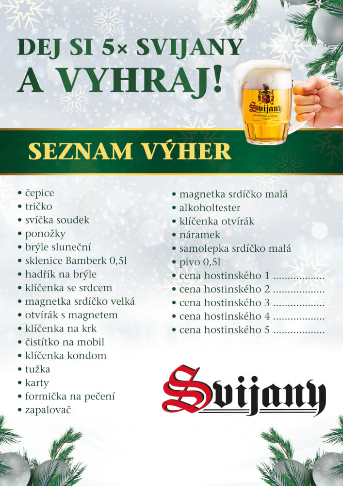 Objednej si 5x pivo Svijany a od obsluhy dostaneš výherní los s unikátním kódem. Zašli kód pomocí SMS, obratem dostaneš SMS, ve které se dozvíš, čo vyhrávaš. Výhru si vyzvedni u hostinského.